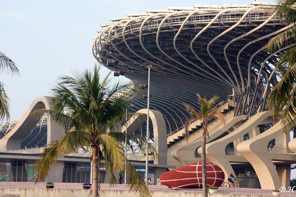 先經過世運主場館-現稱國家體育場,分別從幾個面向來看這座造型奇特的體育場,尤其是座位席上空的太陽能光電板。從世運大道右轉軍校路,世運主場館的造成好像一條翹尾的魚。