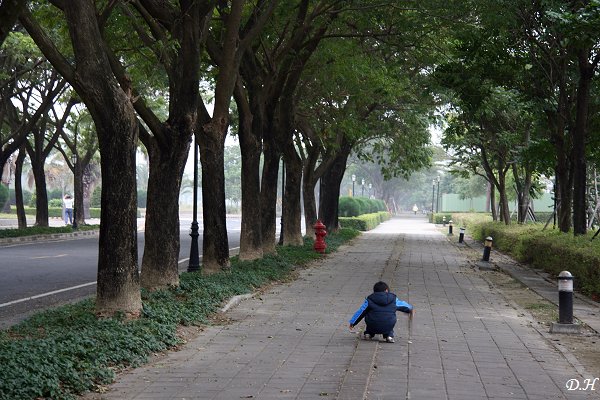 吃完零食,走校園內大操場旁的敬業路往西走,我邊追著大寶邊拍照,寧靜的校園建築物與人行道街景有許多可拍之處。經過學校正門,到了校園地圖上註明應該有花海的地方,卻看到正在蓋行政大樓。繼續往前,過了向陽路,這一區有生態河道環繞,河道上有多處小橋跨過,不過水流有些停滯。黃昏,環校園的自行車道上仍有人在騎腳踏車,至於親子散步的三兩人群則正往校門口走回來。
