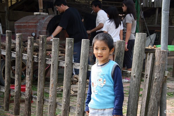 至於桶仔雞完成之後,接下來又在同一個桶子的炭火上可以烤玉米、茭白筍、地瓜等,可以充分體會自己動手做的鄉土樂趣。敏彥的兩個女兒就在桶子旁用報紙搧風讓炭火旺起來。我也想讓大寶拿報紙來幫忙搧風,這小子跑得跟飛一樣。