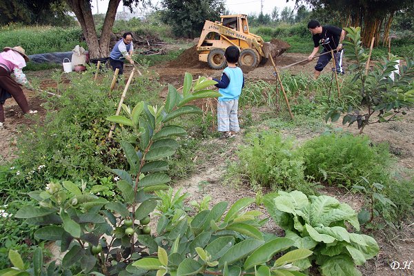 正在後院亂拍之際,聽到慧玲在找我過去,原來是大寶吵著要找爸爸正在哭。至於找爸爸何事?原來是想要上大號,要老爸擦屁股。大寶上完廁所又繼續到處玩耍了。這時我看到世紘和敏彥還有一位朋友走出屋子,朝蔬果種植區去了,我也好奇地跟過去。