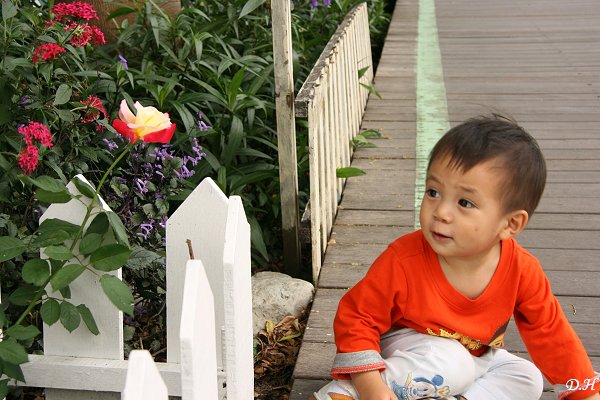 果然來到開封街就看到自行車廊道,我們直覺cheela小屋就隱身在廊道深處。就此下了車,走上筆直的廊道,意會到這應該是利用原舊鐵道搭建的木棧道。在一、二十年前火車還可以開到台東舊站;如今火車不再來了,鐵支路變成充滿綠意的鐵馬廊道。而廊道兩邊的住家也配合社區營造,如栽種花草、彩繪牆壁等。二寶就很喜歡一戶人家的後院中許多旋轉的小風車;盯著直看不動,也不想順著大人的方向走。後來又來到一戶人家後院栽種有黃玫瑰。我抓到二寶回眸時間,來個「男孩看見野玫瑰」。