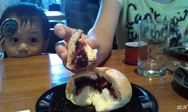 我們兩大兩小大概很破壞咖啡館的午後寧靜氛圍。老婆點餐,我努力拍照,兩個小朋友不安分地在椅子上爬上爬下。老婆除了點了一杯咖啡之外,還點了冰淇淋、起司蛋糕、小屋布丁、桑葚蘋果麵包。小屋布丁上綴有一朵小花,除了那朵小花之外,整個布丁都進了大寶的杜子裡。