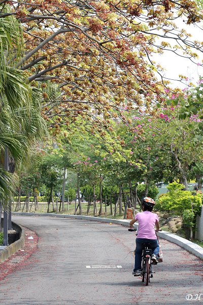 我規劃的路線是逆時針方向。從凹子底公園到愛河之心,順流而上,經慈濟精舍,過大順路,明誠路來到河堤社區,然後在河堤社區用中餐,之後由裕誠路折返。不過今日豔陽高照,這條路線大部分路段都無遮蔭。車行過慈濟精舍後,自行車道兩旁有頂上開著紅花的大樹,碎花落一地,很是令人驚艷,如果陰天恐怕就不會有此亮麗風情。