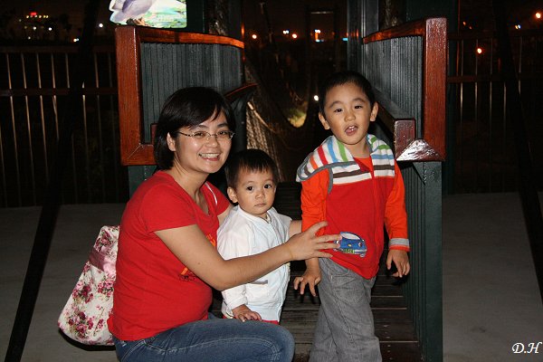 晚上騎乘的路線,還是在愛河中游,因為記起前陣子看到中都願景橋似乎已經通車了。這是一條銜接美術園區與中都濕地公園的景觀橋樑。穿過美術園區,美術東二路往南騎,就看到打上燈光美輪美奐的願景橋,雖然有車輛通行,但整體似乎還未完工,主要是橋下的工程也還在施作。不過屬於自行車專用道的部分倒是通行無礙。有許多人特地來此散步,我們也停下車放小孩下來玩。大寶現在跑來跑去,我們都很少擔心;倒是二寶不按牌理出牌,需要時時看顧。