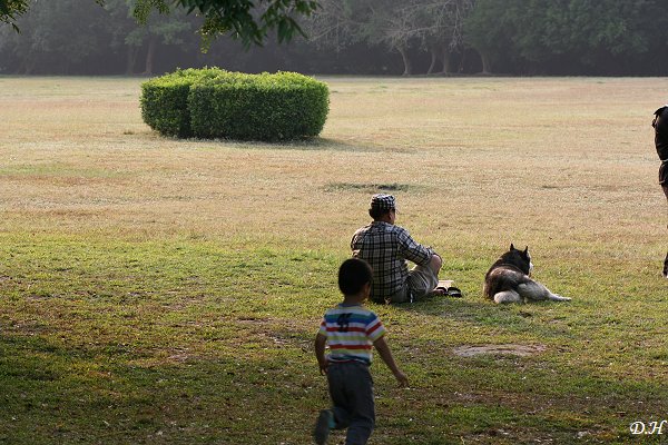 大草原上有人在放風箏、丟飛盤、踢球打球,還有人帶狗來玩。大寶說要去追狗,我們急忙勸阻,那幾隻狗狗們現在很忙,萬一壞了牠們好事,極有可能被反咬一口。