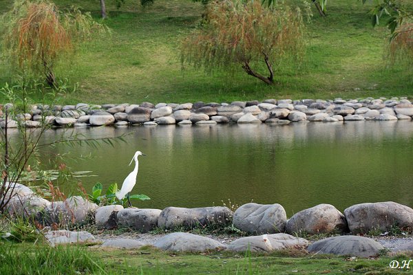 由於老婆和大寶已經不知道走到哪裡去了,我們就在此折向下到湖畔,環湖半圈又回到上方腳踏車停車處去等他們。會合後,大寶和二寶又在大草地旁的階梯玩了一會葉子。我偷空去拍停在生態池畔那隻白鷺鷥。那白鷺鷥不管飛離幾次,回來之後還是很習慣停在固定的位置,彷彿它才是這裡真正的主人。
