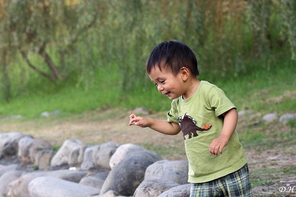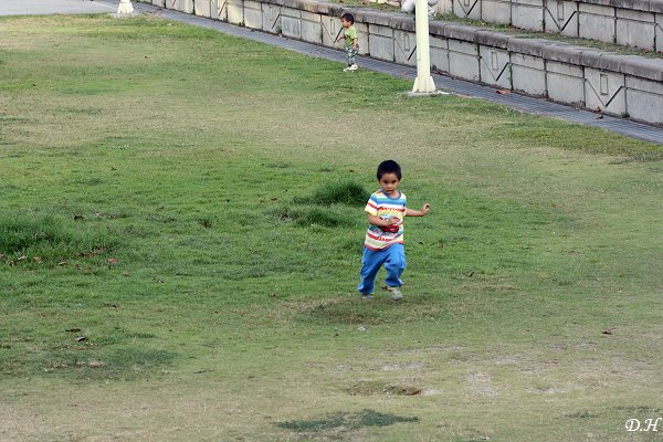 我們帶著小孩開始環繞生態池。有許多人在池畔垂釣。但二寶只想把小石子丟進水裏,然後呵呵大笑,像是完成一件有趣的事情。他光是這樣來回丟石子就夠了,根本不想往前走環湖。伊阿娘帶著大寶自去散步了,留下只想就地玩丟石子的二寶給我。我好幾次要把二寶抱起來帶走,他都極力反抗想要再下來玩丟石頭。就這樣我們沿著湖畔抱抱走走,連湖一半都走不到,而老婆和大寶已經走到綠草坡的上方去了,那算是外環的步道。