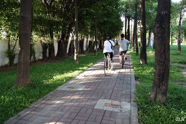 從東門路往左營方向騎,在快遇到鐵道前,就能接上可通往蓮池潭的自行車道,這一段自行車道兩旁有一排高大的桃花心木,應該是全高雄獨有的「森林自行車道」。但官版的愛河連接蓮池潭自行車道路線是從漢神巨蛋經新莊一路到蓮田棧橋,並沒有經過這片桃花心木林。