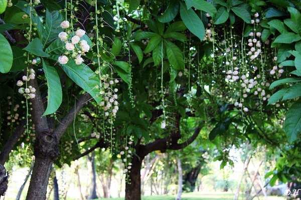 原生植物園中寬大的水圳,曹公新圳分支之一-洲仔洋圳,在靠近崇德路端突然進入一個小小的涵洞,或許就在這裏鑽入地面下注入附近的蓮池潭。過了翠華橋下,來到原生植物園,上方的天空正藍。前方一片矮林中有人在拍照,趨前一看,原來從樹上垂落許多一顆顆花苞,有的爆開成放射狀,遠近樹上皆有串花,朦朦朧朧像是一簾幽夢,但地上又有掉落的花朵又像是大珠小珠落在綠色地毯。稍後我才想起,莫非這是「穗花棋盤腳」?