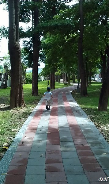 今早老婆去買菜,我和兩個小兒騎著小摺經華榮路要往原生植物園。原本我們都會取右經左營站往翠華橋方向,但今天我注意到往左似乎也有跟右邊一樣的桃花心木林,於是便決定先取左看看。果然這也是一條林中的自行車道,而且從路面上所鋪的磚看來這車道應該是新近整理好。騎著騎著經過一處溜滑梯,又覺得這溜滑梯好像有點年代..,所以這一段自行車道是否為新近鋪設的,我也有些疑惑了。