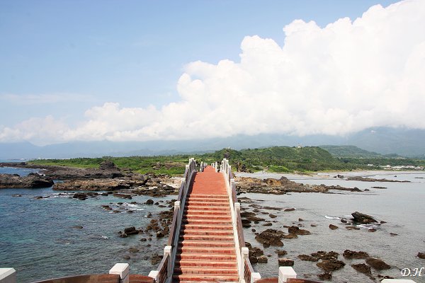 頂著大太陽好不容易走來到八拱橋,而上了八拱橋開始走卻又似一直走不到對岸。碧海藍天的美景換個說法就是陽光直曝。牆下的潮間帶海水清澈湛藍,魚兒翻轉閃躍魚肚光芒。我和大寶走在前頭,率先走完了八拱橋。天氣如此炎熱,二寶走走停停,老婆準備走多少算多少,隨時找個亭子納涼。