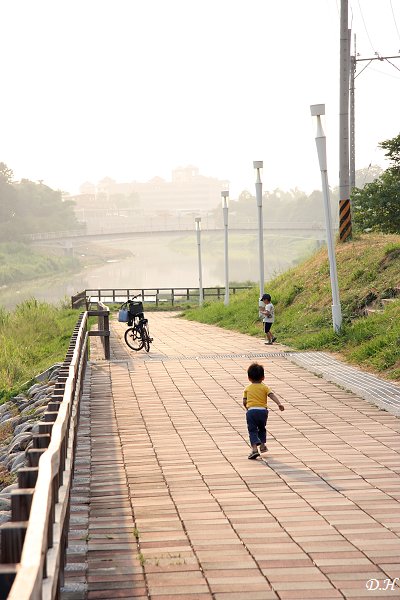 小兒依舊邊走邊跑,不久來到一座有造型中間有遮蔽的人型鋼橋。大寶迫不及待地跑上橋去。二寶不知從哪裡撿來一根大木頭,拿著慢慢走。近看這橋下的水流顏色像是帶點鐵鏽般的黃濁不堪;不過若朝下游看去,在西斜的陽光照射下卻如同鏡面般反映黃昏的天空。