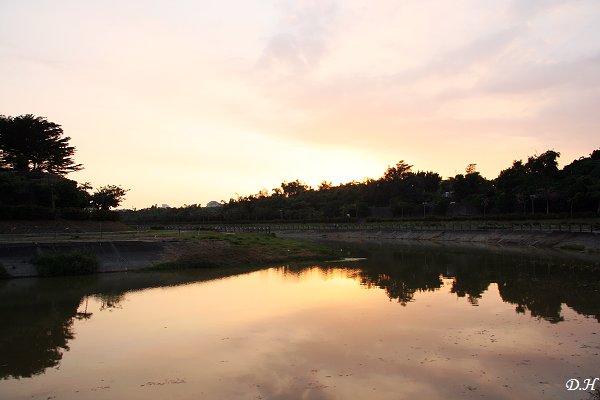 兩小兒在車上的時間少,我們騎不多久,兩小兒就要自己下來跑。轉個彎,上坡,來到一處橋邊,看地圖,這是一、二期園區的交界處,在一期園區這裏是棒壘球場,但邊緣仍屬於林蔭茂密的外環步道。但相對的,過了橋後,來到二期園區卻開闊多了。在這裏讓小兒小玩一下,上車回到橋邊,沿著支流右岸,順流而下,依舊來到匯流口,但續往下游騎,正對著西方,陽光更燦燦了。