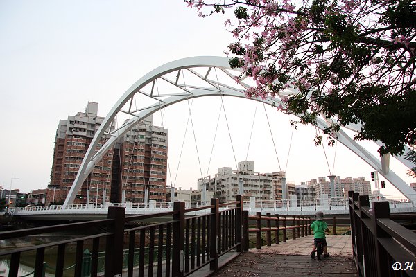 轉過一處河彎後,前方看見一座豎琴橋-益群橋,造型漂亮,吸引我不斷停下來拍照。自行車道來到這裏雖然可以穿過橋下方,但終究還是要透過上岸的棧道來到上方的援中路上。棧道旁有一棵盛開的大美人樹。花多粉紅嬌豔,還有許多含苞待放的。素情自處於豎琴橋畔,只待有緣人駐足欣賞。可惜我到的時候,天光已經有些暗淡了,無法盡得美人粉嫩顏色。但如果來得太早也不好,陽光太強烈又會奪了美人丰采。大寶和二寶依舊只對於在那上坡棧道跑上跑下有興趣。