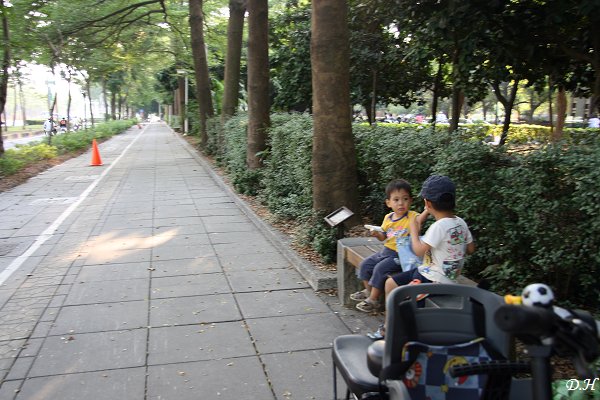 秋天真是個適合從事戶外活動的季節,四點之後,雖有太陽,但氣溫已經不像夏天炙熱。來到都會公園外頭的林蔭大道椅子上坐著,兩小兒吃著伊阿娘為他們準備的米餅與海苔,很是滿足。二寶雖然年紀小,卻懂得將食物分給大寶吃;反倒是大寶雖然吃了二寶的米餅卻不願意跟二寶分享自己的海苔。兩小兒吃完零嘴後,就在林蔭大道跑起來了。我慢慢騎著小摺隨後把他們接起來,繼續往前騎來到德民橋。橋下沿著河岸邊兩旁都有自行車道。