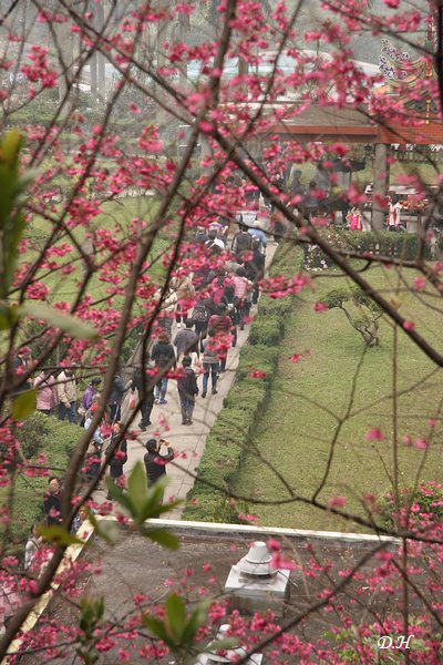 走上階梯後,過了廟門,往土地公廟那邊走去,想去找找看茶花,不過一朵未見。從廁所後面走上山坡,山坡上有一片櫻花樹。透過櫻花盛開中看下方按照進香路線行進的香客,這種對比意味也有名堂,喚做看破繁華紅塵。