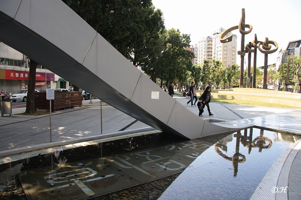 科伯說台中市現在最熱鬧的兩條路,一條是台中港路,一條是公益路。走過台中市民廣場,穿越公益路,右前方是勤美天地,誠品在裏頭,回頭再來逛。至於中間綠帶有類似吧台的地方,提供高腳座位。我們稍後走回來時,看到街頭藝人已經在此表演,坐在高腳椅上便可悠閒喝飲料看表演,猶如是個戶外的吧檯。
