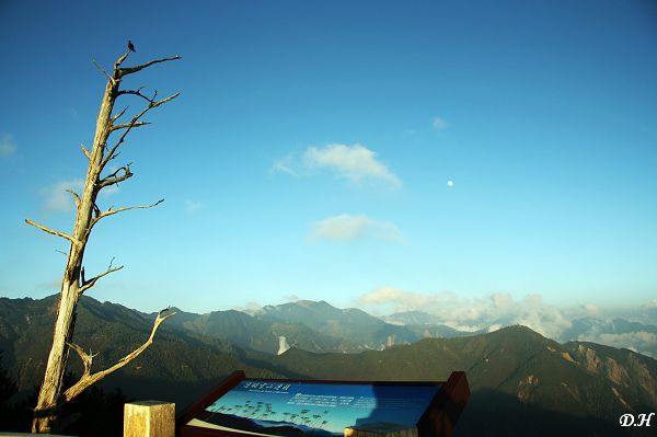 就在飽覽群山的此時,有一隻不知名的鳥兒飛來枝頭上停駐,一直叫著。而近處也似乎也有另一隻在跟它互相呼應。讓我搞不清楚,它是在求偶,而是怪我們佔了它覓食的地盤。後來觀景台來了一車的遊客,於是我們等不及看到夕陽就先離開了,不過在回到停車場時還是能看到一丁點夕陽餘暉也算聊勝於無了。
