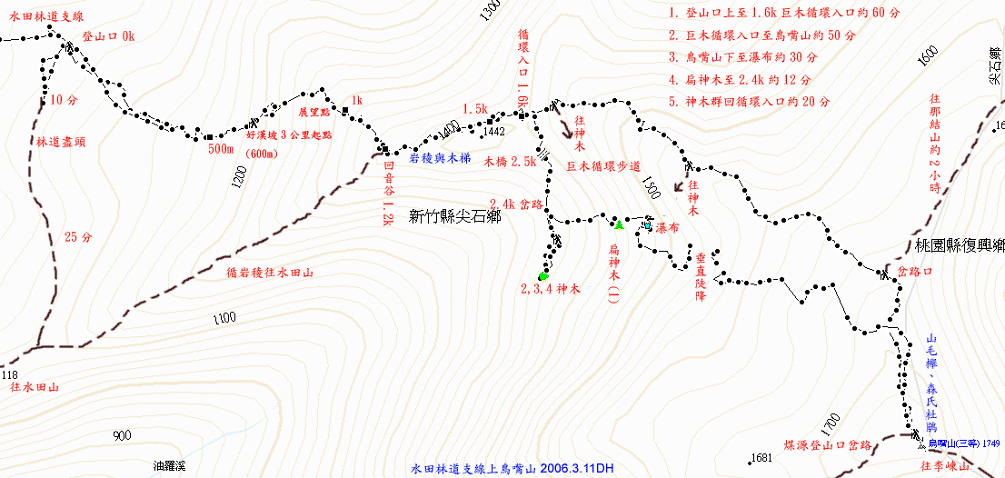 北得拉曼步道上除了有蘭花之外,還有巨木。巨木不多,只有四棵。鳥嘴山稜線上,回程從瀑布下,回到1.6k的循環步道口正好又是一個環形。走不過癮的,就再沿著稜線走到水田山去吧。除了蘭花、神木,山頂附近還有森氏杜鵑與山毛櫸,松樹與馬醉木也頗有可觀,這是我們在快登頂時所遇到正要下山的隊伍極力推薦的。