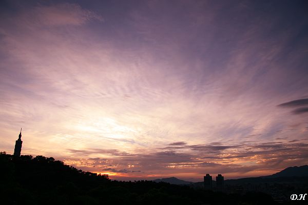 世上如果有不變的真理,那其中之一就是今日太陽下山之後,明早依舊還會爬上來。不過如果從天文學家的角度來說,這句話在四、五十億年之後,也是錯的,因為那個時候太陽中的氫將會燃燒殆盡,太陽將變成一個紅巨星,體積開始膨脹,把水星、金星,包括地球在內都要吞噬了,所以到那個時候也沒有人陪你看甚麼日出日落了。於是把握太陽自我毀滅前(?),在星期天的傍晚六點多,陪著老婆去住家周圍的虎山溪步道散步從松山慈惠堂往真光禪寺方向走去;有幸在登上步道途中的高處看到此時的彩霞滿天,佐以傍晚習習涼風,心中因此頓生無限快意,人生之樂盡在此中矣。