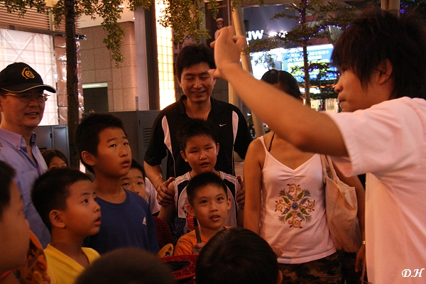 吃飽飯,再沿著新光三越的中庭散步回信義路上要搭公車,夜晚這一帶很熱鬧,有許多街頭藝人吸引了往來人潮停佇,正好這個時候父母帶著還在放暑假的小孩出來逛街。這些街頭藝人包括:演唱的人、畫素描的人、模仿不動的人、捏麵人、折吸管弄出小玩意的人,另外還有一個年輕的魔術師,他表演的是球會消失,也會從想像不到的地方再跑出來,總之大人、小朋友都看得很高興,尤其是小朋友的眼中顯露出新奇,想要問為什麼的神采,一旁的我也感染到這股歡樂,於是便將這一幕給照下來。