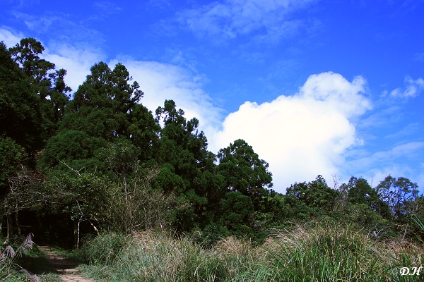 譬如這張在頂山線步道2.0k附近要進入柳杉林之前,看到白雲從樹林上冒出頭來,心中正好想到「想要的與需要的」這個問題,沒有偏光鏡的情況下,為了讓藍天更藍,白雲更白,而樹林前端的步道入口依然清楚,於是採用負的曝光補償讓顏色比較飽和。