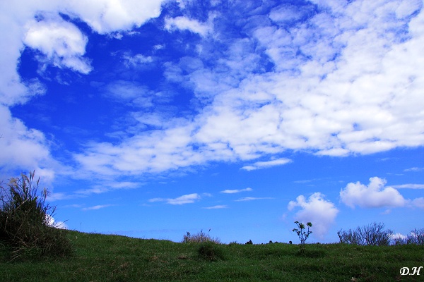 從過了步道3.0k不遠的地方離開步道主線右轉上林中山坡後,突然豁然開朗看到一片草原。為了想要表現看到草原的驚喜,採用略為仰拍的方式,而且並不是將大片草原拍入鏡,而是以廣角鏡運用大片的天空來襯托藍天下的廣闊圓弧狀的天與草原的界接線條。