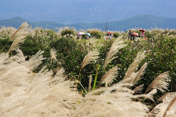 在石梯嶺「印」字牌附近,透過金光閃閃的芒草花浪前端看到不遠處的小草地上席地而坐的賞芒人群。以模糊芒花當前景,加上正的曝光補償,創造出秋高氣爽下金光在芒花浪上耀動的感覺。