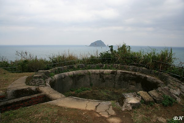 過了活動中心,步上似乎新整修的碎石步道,轉了兩三個彎,看到一株大樹,就上到了社寮東砲台所在的山頭了。其實這處砲台週遭的環境似乎已經有經過完善的整理了,而且也立了說明告示,不過告示只有一個,說明這處砲台看得出有日治時期的建築風格,不過說明告示也未免少了點,在砲台更前緣那邊的營房那裡就完全沒有說明了。從砲台前緣那裡步上石階,很快地就可以看到狀闊的海景了,正前方海面上正是基隆嶼,走過圓形的砲台基座往左邊再看下方是和平島海濱公園,而海蝕斷崖的上方有水泥建築設施,應該就是社寮西砲台所在了。