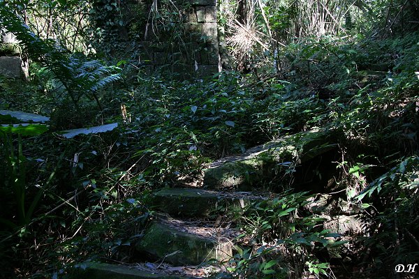 續行,於小水流旁見錯落石塊為石階路,頗有古意,再上行,果然看到左上方一間石頭厝,石頭厝前有一小小橋,在此拍照觀察石頭厝的石頭堆砌法。過此石頭厝後,更大片的石頭古厝錯落於右方的山坡,注意尋找此處是否有小土地廟,未果。此處昔日應該也是自成一聚落。