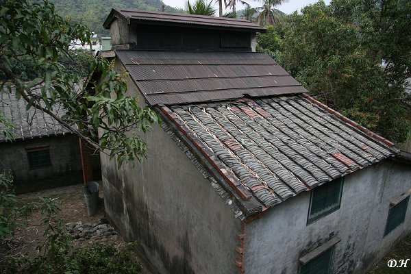 廟埕前斜坡的龍壁以及隆起的地基,讓龍壁斜坡看起來就像曾是神社參道。於是我把廟前廟後走了一圈,沒有發現更多的神社遺跡,倒是看見一間保存良好還有亭仔腳的菸樓。美濃發展菸業的歷史約可溯及日治昭和時期,菸業與糖業都是日治殖民時期留下來的經濟產業,不過由於經貿全球化的關係,美濃菸葉種植於2006畫下最後句點,介紹可看這裡。菸樓就是用來燻烤菸草葉及存放菸草的空間,樓層挑高並多為土埆磚砌,後來也有紅磚式結構,不過烘烤及保存的效果不如土埆厝;而為了排煙,在於屋頂加設看似一小尖頂閣樓,形成有二層樓屋的特有風格,烤菸室側面設「地窗」,透過熱空氣上升帶動冷空氣從地窗流入造成空氣的流動,把菸葉上水分帶走。至於菸樓又分大阪式菸樓與廣島式菸樓這又不是一下子說的完了,不過美濃地區是以大阪式菸樓為主。