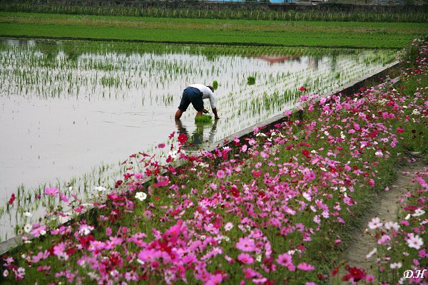 美濃波斯菊花海與無米樂的對照,這張真美,對鄉下出身的人更有親切感,因為鄉下的父老就是這麼辛勞。
