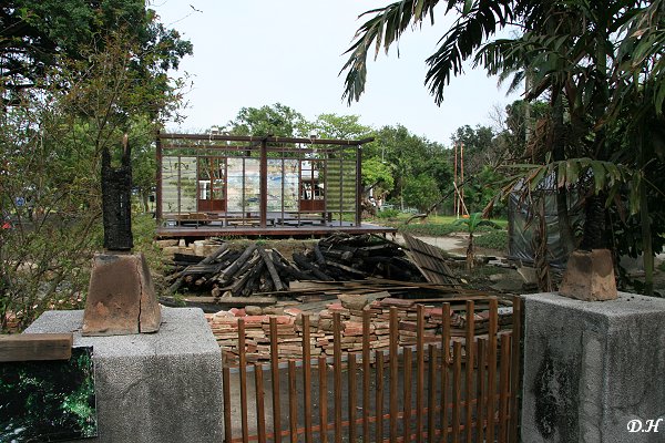 然後在左方的空間陸續是雨豆樹廣場與一個日式庭園,中央有一棵大樟樹,這就是新近整理出來的白屋招待所,從去年(2008)台糖將這個區域公開招租之後,這塊區域就慢慢整理出來包括,從簡介可以看出文史工作者的努力,因為連一草一木一牆一石的典故都介紹的非常清楚:如百年鐵刀木、大樟樹、防空洞、噴水池、黃花夾竹桃、真是好家在的未爆彈、鐵器裝置藝術、庭園舊石、洋玉蘭、崩壞的茶室、金絲竹林、有幾何造型的紅磚水塔..。這裡的一磚一瓦都介紹的如此詳盡,令人讚嘆這些文史工作者的努力。然而我在猜或許也就是因為這麼的aggressive,反而讓廠方感受到沉重的壓力吧;然而對文史工作者來說,有意義的歷史文物消失得如此輕易快速,又怎能令他們不心急,不採取行動?
