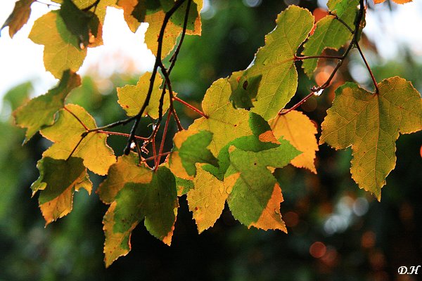 園區桐花只有一小撮開著,不過無妨,今天本就沒帶著看見桐花雪白滿山的預期心情。在環山步道繞了一圈,回到上方的道路旁的木棧道上,這一路上的楓葉反帶來意料之外的美感欣賞,尤其是往善息寺方向走去,昏黃的路燈逐一亮起,樹梢的楓葉因而透著光,只是在葉與葉交錯之間,還是重疊出葉子原本的綠。就是這般的夢幻迷離,讓人分不清那一樣才是楓的顏色。