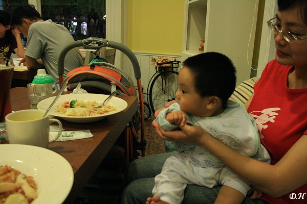 晚餐時間,我們來到住家捷運邊的一家屬意很久的義大利餐廳用餐,店內裝潢擺設頗有格調,可惜餐點差了些,不過小兒在我們用餐過程中一直不太安分亂動亂喊,累得我們夫妻倆一定要有一個帶他出去店外讓他喊個夠再進來,下回我們外出用餐還是選本土的餐館好了,至少店裡面的氣氛不一樣,對於小孩亂吼亂叫應該是見怪不怪。