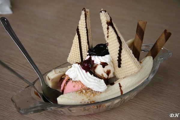 香蕉船,愛之船,情侶兩個一人一匙邊吃冰邊談心;如果一個人吃就會覺得份量太多了。