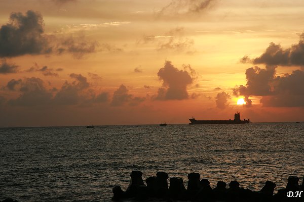 或許是一邊看海一邊等待的關係,我們好像也沒有等很久,就通知我們可以進去了,後來還幫我們換了個靠平台邊可以直接看到風景的好位子。我們到的時間也絕佳,正好是夏日傍晚六點,夕陽將沉未落之際,西方海平面上的雲彩絢爛,沒有了酷熱,只有清涼中帶鹹味的海風。高雄的妙齡女郎有些喜歡濃妝豔抹,也有的穿著清涼,我以拍攝夕陽為由,在平台上到處亂走亂拍;老婆只顧著跟小兒玩耍,狀似不以為意放郎君隨意玩耍去也。