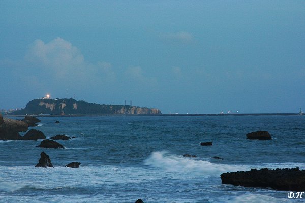 隨著天色漸暗,天空與海面轉為靛藍的顏色,旗后燈塔也亮起來了,黃色的光芒規律地跳動著。拍打著海岸的浪花的前緣,在慢速快門之下,如同水銀洩地般推散開來,在靛藍的背景陪襯之下份外柔美,這一刻我們真的感覺置身在海洋天堂了。