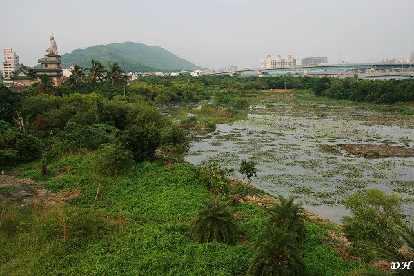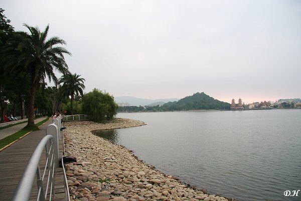 五點公園準時關門。我們走出門外,沿著蓮池潭邊的自行車道散步,黃昏晚風吹來頗有涼意,在突出湖岸的平台上看蓮池潭對岸的龜山、蛇山,又看看右側的湖中的玄天上帝像,這時候我才恍然大悟,地理風水上有龜蛇,當然民間風俗上會需要玄天上帝來鎮守。