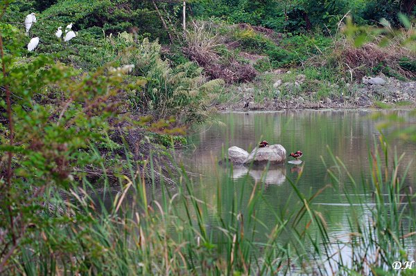 拍夠了白鷺鷥,不過這裡顯然不是志工口中所謂的深水池,而從高處往下看,在瞭望台旁的芳草之間似乎別有幽徑,於是我走下瞭望台,步入幽徑中,過小橋,來到野薑花溪溝畔,續行不久,左側是另一個水池,岸邊似有水鳥,離我太遠看不真切,不過應該就是一對鴛鴦。這時候我左手抱著小兒,右手拿著我的百微,鏡頭對準了那對鴛鴦,總算讓我拍得還可以的影像。
