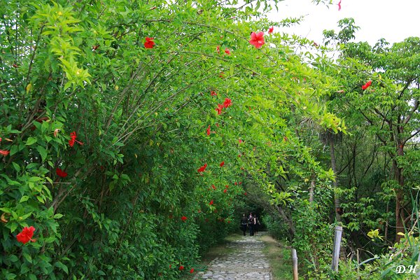 時間已近五點,溼地聯盟的工作小屋外有一小池,中有開著黃花的台灣萍蓬草,我沿著木槿隧道想要往北再走走,不過迎面走來的志工跟我說,他們要關門了..,於是我只好折回。回程在岸邊有看到像是月桃花成串的花朵,問志工,他說這是穗花棋盤腳。