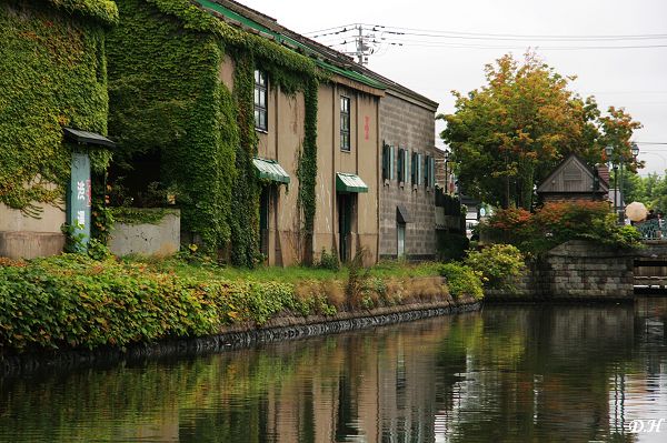 (爬滿藤蔓的小樽運河倉庫河邊倒影)