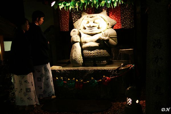晚上我們住進了登別的飯店,飯後去逛了他們的溫泉街,其實沒有太多的特殊之處的一條街,不像台灣風景區晚上那麼熱鬧,有許多活動。特殊的地方大概是溫泉街上有許多各種功用(求戀愛,求病癒..)且造型頗為可愛的「鬼」石雕。另外九點溫泉街上還會有一場閻羅王生氣的表演。