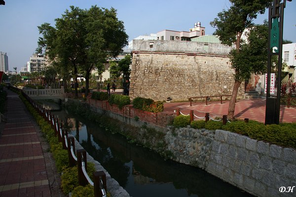 不過為了老婆要買50嵐的關係,我們還是從的原鳳山西城的鳳山捷運站下車了,出捷運站,沿著中華路商店街往北走,不多久就看到平成砲台了,平成砲台是曹謹任鳳山知縣時所建的六座砲台目前尚存且最完整的一座,砲台橫額還能清楚看到「平成」二個大字與「知鳳山縣事曹 謹建」。站在砲台上可以一覽下方如綠色帶狀的曹公圳。這一帶的曹公圳是原來鳳山縣城的護城河,近年來高縣政府大力疏濬與綠化週邊腹地,形成環繞鳳山的綠色親水公園,今日親自一遊,眼見沿著圳道處處釣客,雖然圳溝之水看起來優氧化程度嚴重,不過如果持續改善水質,以曹公圳水岸如此易於親近,台南市人的我反而覺得鳳山可能因為整治曹公圳之後有發展成「台灣的京都」的更優質的潛力。或許在潛意識中有易於讓人親近的水岸,而且清澈的溪水中能夠看到古城倒影,這才是我的京都映像吧。