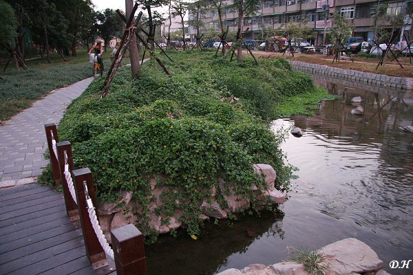 從圖書館前的機車停車棚穿出,繼續沿著公園邊緣的小路北上,出口是老人活動中心,左邊又可以看到曹公圳了,這一條帶狀是曹公圳重點整治區域,整治成果已見到成效,假日都有大人小孩在水圳旁釣魚以及嬉戲,水圳較寬廣處植有浮葉植物如蓮花等。
