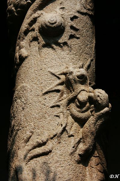 海安宮位於昔日南勢港的咽喉所在,一說是三郊迎湄洲媽祖香火來台所建,一說乃福康安平定林爽文之亂後,為了感念媽祖保佑其行軍順利,班師回朝後向乾隆稟奏興建海安宮,由當時台灣知府楊廷理主其事。海安宮曾毀於日據時期美軍轟炸,唯尚留有殿後的一對龍柱至今其上雕龍仍栩栩如生。這對龍柱跟一般廟宇的龍柱截然不同,龍、火珠、雲彩與石柱雕成一體,線條柔美。我從下而上仰拍之,搭配光線陰影產生層次,龍吐珠騰雲而上之勢躍然而出。海安宮附近另有日月井,井邊壁上嵌有兩方石碑,其中有懷念台灣第一任知府蔣毓英之『臺灣郡侯蔣(毓英)公去思碑記』石碑,乃康熙年間所立之古碑,為台灣現存五大古碑之一(最早古碑為現存大天后宮之施琅「平臺紀略碑記」),對於了解台灣剛進入清領時期的開拓歷史,頗值得到五條港時順道一遊。其碑文台灣府志中有收錄,不過現今碑文斑駁,部分字跡難認,全文大致如下: