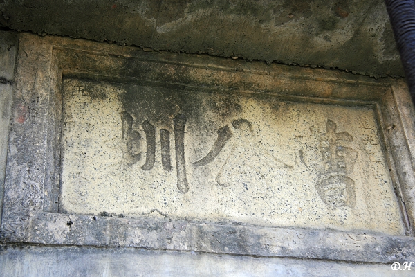 (新埤仔汴三圳共構,圖片上方為舊圳分水門,水橋與圖片下方的水泥橋包覆的是來自新圳的水,水泥橋下方的是由舊圳分出的鳳山圳。舊圳分水門上至今留有被塗抹的「昭和二年七月」字樣)