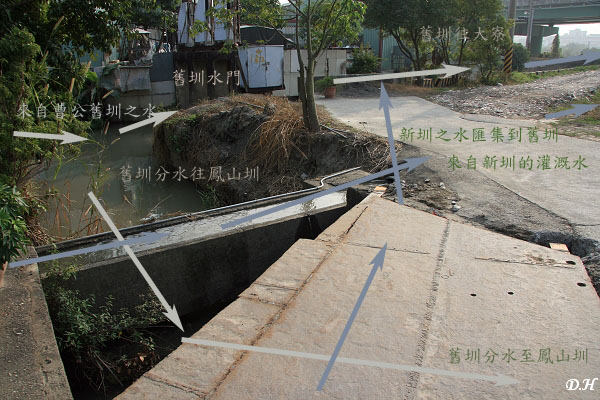 在漫步這三圳交會之處時,對於三圳如何共構有疑惑,主要是新圳地勢較高,由新圳開水門導水到舊圳時,水流是湍急的;而舊圳水流合緩,流到日治所建的水門時,大部分的水被攔住轉向右前方分支成鳳山圳,這路線必須穿過新圳引水水道,理論上以平面視之,這兩圳的水一緩一急將會交會。但是穿過新圳的鳳山圳的水流依然是和緩的慢慢流著,這就表示這兩圳其實並未會流。我因此猜測這三圳應該是立體共構,也就是新圳引水道是架在鳳山圳水道之上的涵洞。簡單來說新圳引水道是二樓,舊圳與鳳山圳是一樓在同一個月台的不同側,水門旁的新圳之水倒入舊圳就是在下樓。