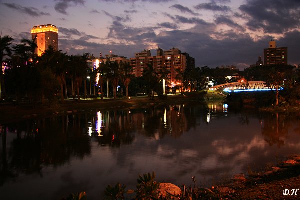 離開聖母堂之後,續沿五福路往東行,經城市光廊再到中央公園。中央公園前身為中山體育場,腹地廣大,腹地有眾多商圈百貨(如新堀江商圈、大立百貨等)等聚集。公園內有水舞廣場、人工湖,當夜幕來臨之時,湖上之橋點亮燈光,湖面映照出天空浮雲、光橋,以及週遭商圈的五顏六色,令我多次走走停停想要多拍幾張夜景,招來過路行人跟我說,湖邊蚊子很多喔,意思是說放著嬰兒車中正在酣睡的小兒這樣沒關係嗎?我是沒感覺有蚊子啦,不過既是人家好意提醒,於是便收工走回捷運站。捷運中央公園站體由建築大師理察羅傑斯設計,外形宛若飛揚的祥雲,站體內樓梯中有瀑布水流亦頗為少見。高雄捷運車站年輕有創意,如果客來高雄出入捷運站時,不妨放慢步伐細細體略這些公共藝術創作。