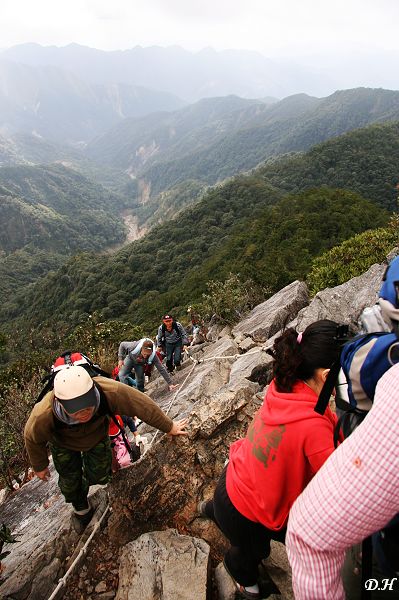 總之一開始的岩稜雖然也算驚險,不過漸漸習慣也就度過了。後來爬上一道像是新店獅子頭山的木梯(11:00)之後進入另一個階段,更高更險,更沒有樹木,更沒有拉與附著之物,直接面對一邊是垂直岩壁,一邊是萬丈深淵。怎能不叫人腳底發麻?這樣的岩稜處處是驚奇,時時都有考驗,每一步都走得膽戰心驚,只能夠顧得了先過了眼前這一關,而心中卻一直嘀咕著到底像這種艱困的岩稜還有多久?而前面後面都有人,所以不能走得更快,也不容你稍作喘息太久。